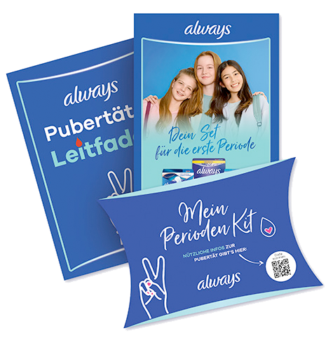 Neben der Nutzung der Unterrichtsmedien können Schulen beim Themenportal Pubertät auch kostenlose Perioden Kits für ihre Schülerinnen anfordern. Jedes Perioden Kit enthält eine Auswahl an Monatshygieneproduktproben sowie einen QR Code, über den ein jugendgerecht aufbereiteter Infoleitfaden mit wichtigen Informationen rund ums Erwachsenwerden und praktischen Tipps zum Umgang mit den damit verbundenen Veränderungen und Herausforderungen heruntergeladen werden kann.